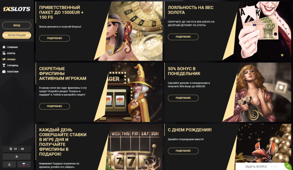 В 1xSlots действует приветственный бонус, выдаются фриспины и начисляется кешбэк. Площадка поддерживает несколько популярных платежных сервисов. Они дают возможность быстро и безопасно проводить любые финансовые операции. С выплатой призовых средств никогда не возникает затруднений.